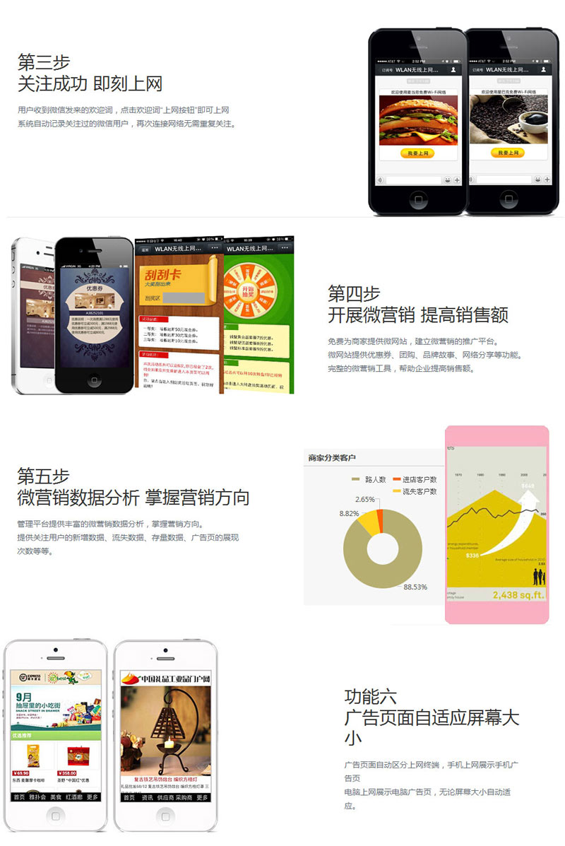 當(dāng)越來(lái)越多的企業(yè)在微信上建立公共賬號(hào)時(shí),我們可以發(fā)現(xiàn)微信以迅猛之勢(shì)滲透到我們生活中的每個(gè)角落,可以說(shuō)微信的前景被普遍看好。在此背景之下,金良網(wǎng)絡(luò)緊跟市場(chǎng)需求,推出無(wú)線wifi微信認(rèn)證功能,幫助企業(yè)更好的管理WiFi無(wú)線網(wǎng)絡(luò)以及產(chǎn)品營(yíng)銷推廣。 1、微信營(yíng)銷面臨難題 雖然微信營(yíng)銷方法多種多樣,但是每個(gè)企業(yè)微信運(yùn)營(yíng)者都也都將面臨一個(gè)重要難題,那就是:微信粉絲的積累問題。企業(yè)應(yīng)以什么方式積累粉絲量?如何在積累粉絲量的同時(shí)不掉粉?怎么才能吸引粉絲自愿關(guān)注該企業(yè)公共賬號(hào)?與此同時(shí)分析粉絲的消費(fèi)能力、消費(fèi)習(xí)慣、關(guān)注熱點(diǎn)等并制定出針對(duì)性的營(yíng)銷策略等問題也非常重要。 可以說(shuō),企業(yè)公共賬號(hào)的粉絲量是品牌傳播、商業(yè)推廣的基本條件,但在微信前期如何在積累粉絲量的同時(shí)又能保證不掉粉是微信營(yíng)銷的第一步,并且也是企業(yè)將面臨一個(gè)瓶頸性問題,那么該如何快速收集到目標(biāo)粉絲呢? 金良網(wǎng)絡(luò)無(wú)線wifi的微信認(rèn)證上網(wǎng)功能,則為運(yùn)營(yíng)商解決了這一難題。 2、Wifi營(yíng)銷的飛速發(fā)展 近幾年WIFI營(yíng)銷這個(gè)項(xiàng)目可以說(shuō)是炙手可熱,就連移動(dòng)互聯(lián)網(wǎng)的大佬都想進(jìn)來(lái)湊個(gè)熱鬧?傮w上來(lái)講,WIFI營(yíng)銷分為三個(gè)階段,第一個(gè)階段,是WIFI營(yíng)銷的初級(jí)階段,這個(gè)時(shí)候,商家認(rèn)識(shí)到了WIFI網(wǎng)絡(luò),也提供了一個(gè)免費(fèi)的WIFI信號(hào)給到客戶.但是因?yàn)樽陨韺拵У膯栴},還有本身硬件問題,導(dǎo)致客戶無(wú)法進(jìn)行良好的體驗(yàn),而且每次要咨詢店員密碼,體驗(yàn)不是很好. WIFI營(yíng)銷的第二個(gè)階段改良了WIFI的驗(yàn)證方式,客戶可以自助獲得上網(wǎng)密碼.另外也提供了專門用來(lái)支持多人上網(wǎng)的WIFI設(shè)備,所以體驗(yàn)有所提升。其主要模式是賺取第三方的廣告費(fèi)用,設(shè)備免費(fèi)給商家使用.但是從目前的情況來(lái)看,雖然它占據(jù)了大量的機(jī)場(chǎng)和快餐店鋪,但是商業(yè)模式還是值得商榷的問題. WIFI營(yíng)銷的第三個(gè)階段,應(yīng)該是大數(shù)據(jù)階段,移動(dòng)互聯(lián)網(wǎng)產(chǎn)業(yè)研究院最近推出的微信營(yíng)銷系統(tǒng),不僅有WIFI的基礎(chǔ)功能.同時(shí)增加了線下用戶的大數(shù)據(jù)分析.為不同層次的客戶,提供不同類型的廣告展示. 3、當(dāng)微信與無(wú)線wifi相結(jié)合 大數(shù)據(jù)商業(yè)化、商品化的模式’正有望成為繼門戶網(wǎng)站、搜索引擎、社交媒體之后新一波的創(chuàng)業(yè)浪潮和產(chǎn)業(yè)革命。WIFI作為移動(dòng)大數(shù)據(jù)的入口,即將展示它最有魅力的一面。而金良wifi是一站式智能營(yíng)銷平臺(tái),其中功能之一的微信認(rèn)證就是幫助商家微信獲得更多目標(biāo)粉絲的重中之重。在剛剛過去的一年里,金良wifi足跡遍布全國(guó)各地,在此之后,顧客如果想在景悅城內(nèi)免費(fèi)上網(wǎng),只需一鍵關(guān)注商家微信掃描二維碼即可,簡(jiǎn)單方便!這樣一來(lái),店內(nèi)客流量百分百轉(zhuǎn)化為微信粉絲量,目標(biāo)顧客迅速成為商場(chǎng)微信粉絲,后續(xù)的微信營(yíng)銷也就隨之順理成章。 對(duì)普通用戶來(lái)說(shuō),使用微信認(rèn)證來(lái)獲取免費(fèi)Wi-Fi服務(wù)方便快捷,不用再去詢問是否有Wi-Fi、鏈接密碼是多少等;對(duì)于提供免費(fèi)Wi-Fi的商家而言,此舉可減少客服人員的工作量,大大節(jié)省工作人員時(shí)間成本,并輕松獲取大量的目標(biāo)粉絲,實(shí)在是一舉兩得之好事。 |
